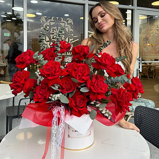 Red Roses & Eucalyptus Flower Bouquet In A White Box