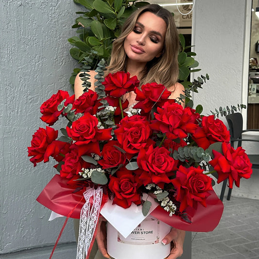 Red Roses & Eucalyptus Flower Bouquet In A Box