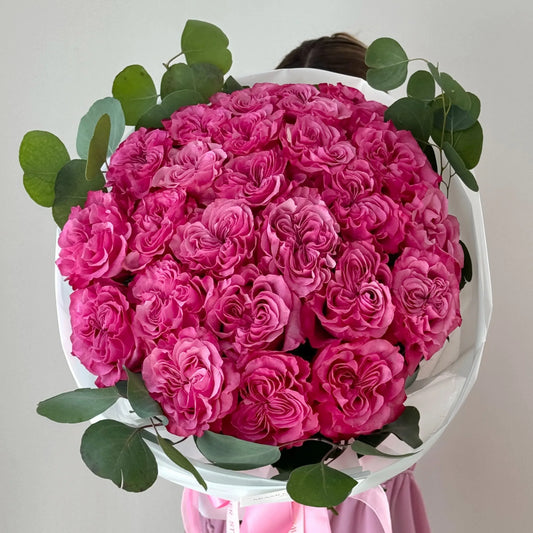 Rose Flower Bouquet With Bright Pink Roses & Eucalyptus