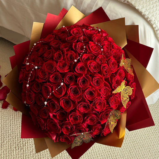 100 Red Rose Flower Bouquet With Gold Butterflies