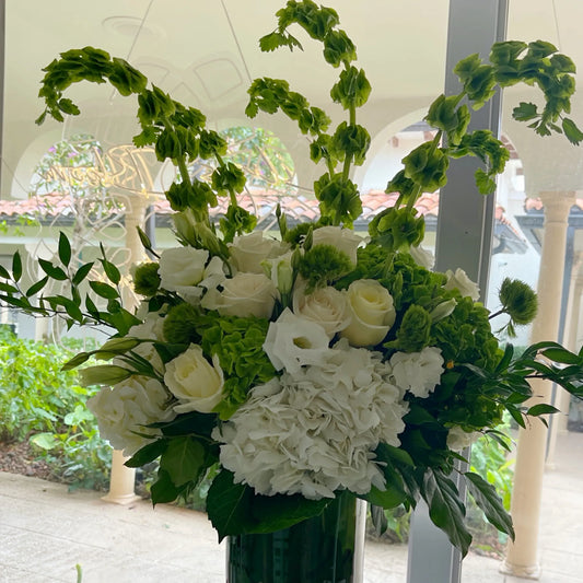 White Rose Flower Bouquet In A Vase With Ranunculus, Lisianthus, Hydrangea & Greens