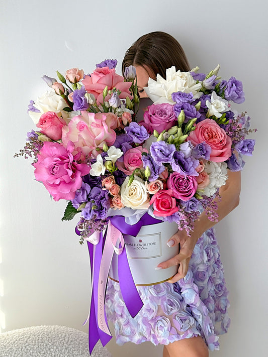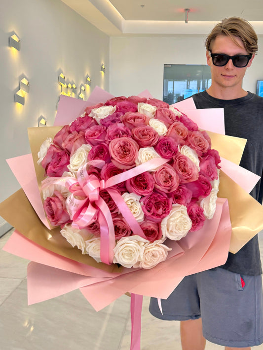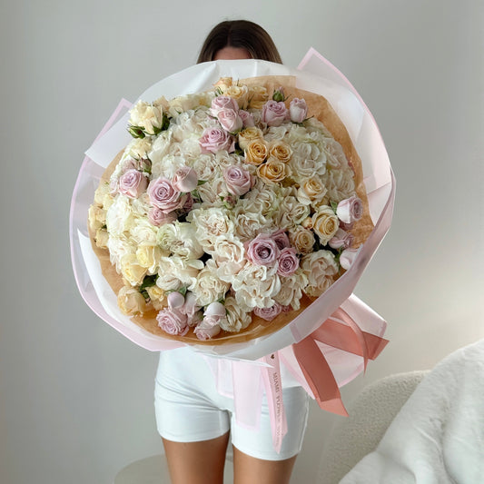 Surprise someone special with our Mixed Roses Flower Boxes & Bouquets. Each arrangement—from a classic dozen blooms to an opulent 300+ mix—is handcrafted in a luxurious Russian floral style. Choose between elegant hand-tied bouquets or stunning flower boxes (round hat boxes, square gift boxes, or jumbo textured designs) in your choice of colors and finishes. Our expert florists blend multiple rose varieties—garden roses, hybrid teas, spray roses—alongside hydrangeas, peonies, tulips, orchids, ranunculus, and more, creating depth, texture, and a symphony of color.