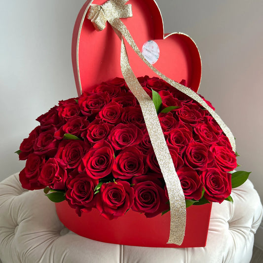 50 Red Rose Flower Bouquet In Heart Shaped Box