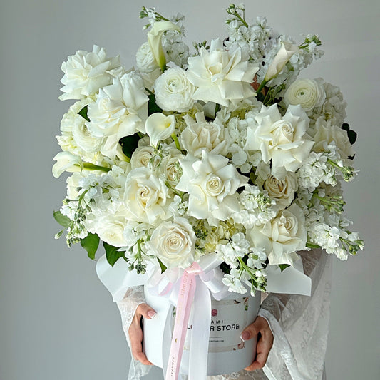White Rose, Callas, Ranunculus, & Stock Flower Bouquet In A Box