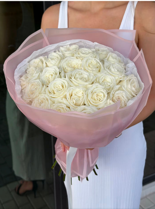 To make your arrangement even more unique, we blend our white roses with premium blooms like spray roses, hydrangeas, tulips, orchids, ranunculus, carnations, stock, and lush greens. Each bouquet is styled in the luxurious and feminine Russian floral design we’re known for. Adornments such as pearls, delicate butterflies, golden crowns, and graceful bows add an extra touch of beauty to your bouquet.