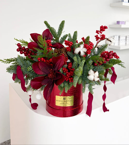 Traditional Christmas Arrangement With Red Roses & Hydrangea.